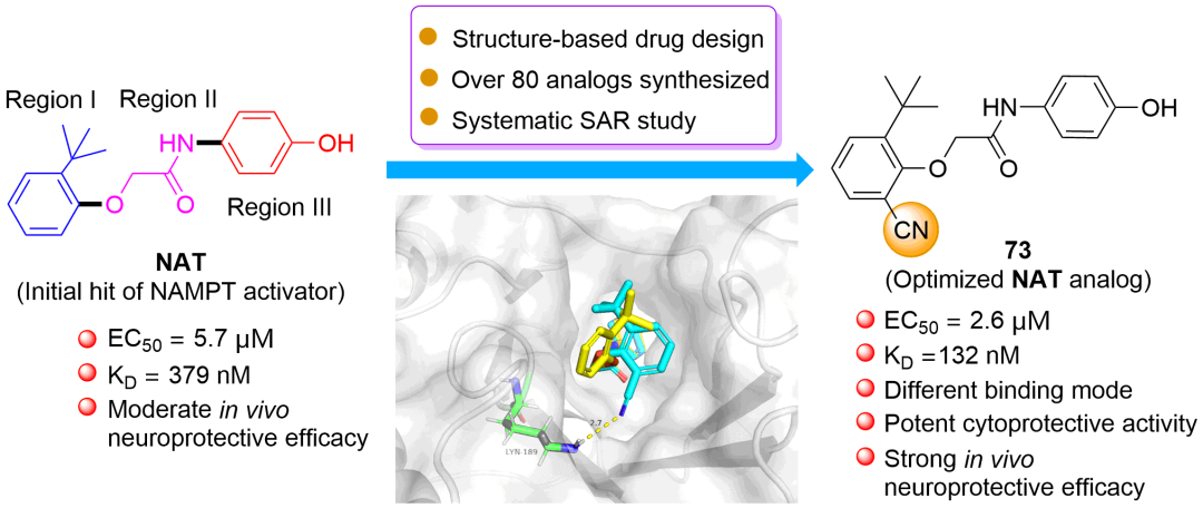 清华新闻网5月10日电 近日,乐竞(中国)一站式服务平台药学院王戈林和唐叶峰团队针对人口与健康领域的重大需求,瞄准NAD代谢调控和神经退行等衰老相关疾病这一新的科学前沿热点,通过高通量药物筛选和基于靶点结构的理性药物设计,获得了靶向NAD生物合成限速酶烟酰胺磷酸核糖基转移酶(NAMPT)的新型小分子激活剂(NATs),为开发治疗神经退行性疾病的创新药物奠定了基础。