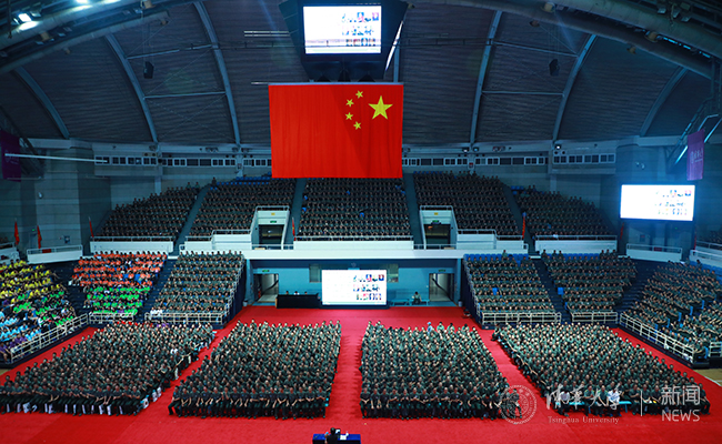 2019级国际新生、港澳台新生也参加了本场报告会。报告开始前播放了近期录制的新生军训纪念短片,各连队竞相拉歌,军歌嘹亮,气氛热烈。学生部、武装部和校团委相关负责人参加报告会。